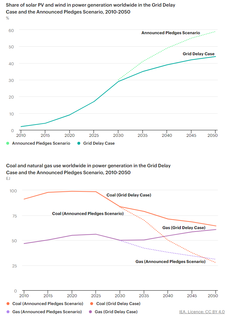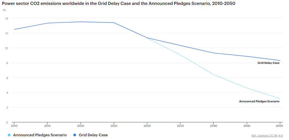 A new scenario developed for the report, the Grid Delay Case, examines what would happen if grid investment is not scaled up quickly enough and regulatory reforms for grids are slow. It finds that cumulative carbon dioxide (CO2) emissions between 2030 and 2050 would be almost 60 billion tonnes higher due to a slower rollout of renewables that results in higher fossil fuel consumption. This is equivalent to the total CO2 emissions from the global power sector over the past four years. It would put the global temperature rise well above the Paris Agreement target of 1.5 °C, with a 40% chance of exceeding 2 °C.