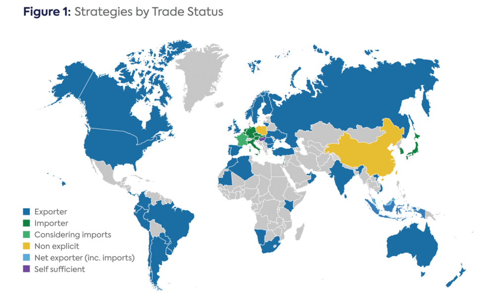 Most strategies position their country in terms of future trade, including whether the nation is seeking importer or exporter status, the trade medium (whether the product imported or exported will be in the form of hydrogen or a hydrogen derivative), and the value, ranking, or economic benefits the nations expect to achieve.