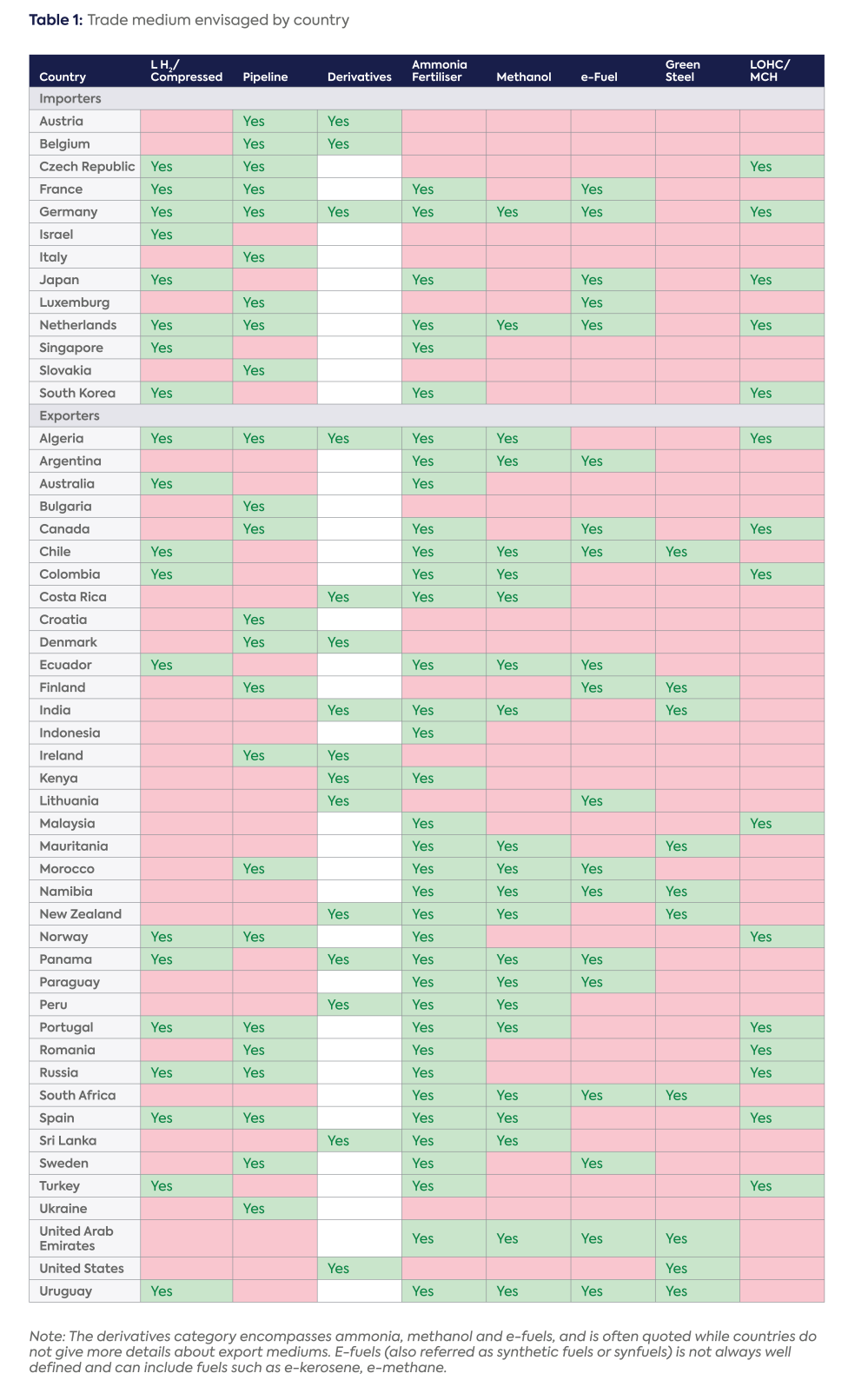 Most importing countries consider a relatively wide range of these trade mediums. They are weighing factors such as cost, what delivery mechanisms will be available from suppliers, and geographical constraints. Germany and the Netherlands, for example, seem to be open to various supply options, while landlocked Luxemburg is only considering pipeline imports of hydrogen and e-fuels.