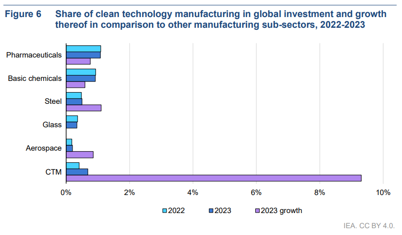 Investment in clean technology manufacturing is becoming so significant that it is starting to register in broader macroeconomic data. In 2023, it accounted for around 0.7% of global investment across all sectors of the economy, driving more spending than established industries like steel (0.5%). In growth terms, the contribution is even starker – in 2023, clean technology manufacturing alone accounted for around 4% of global GDP growth and nearly 10% of global investment growth.