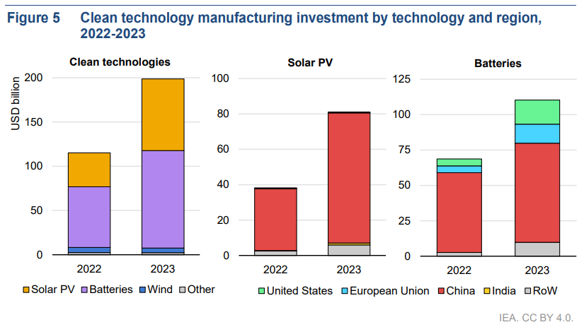 New, first-of-its-kind analysis in this report shows that investment in clean technology manufacturing stood at around USD 200 billion in 2023, growing by more than 70% relative to 2022. Investments in solar PV and battery manufacturing plants led the way, together accounting for more than 90% of the total in both years. Investment in solar PV manufacturing more than doubled to around USD 80 billion in 2023, while investment in battery manufacturing grew by around 60% to USD 110 billion.