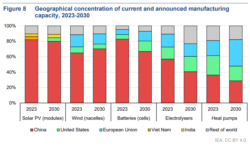China, the United States and the European Union together account for around 80% to 90% of manufacturing capacity for solar PV, wind, battery, electrolyser and heat pump manufacturing. Little change to this overall concentration is foreseen to 2030, even if all announced projects come to fruition.