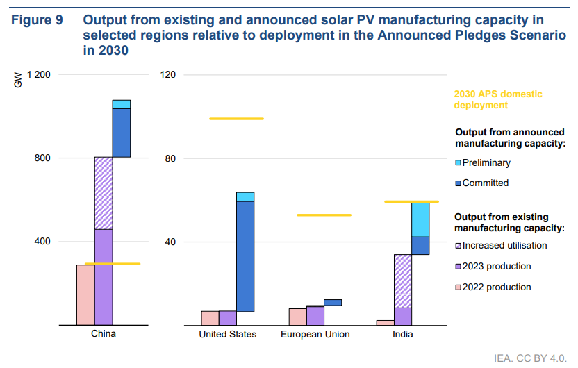 China alone accounts for more than 80% of global solar PV module manufacturing capacity and 95% for wafers. This looks unlikely to change significantly this decade, with the country set to match or exceed the capacity additions planned in other countries like the United States and India.