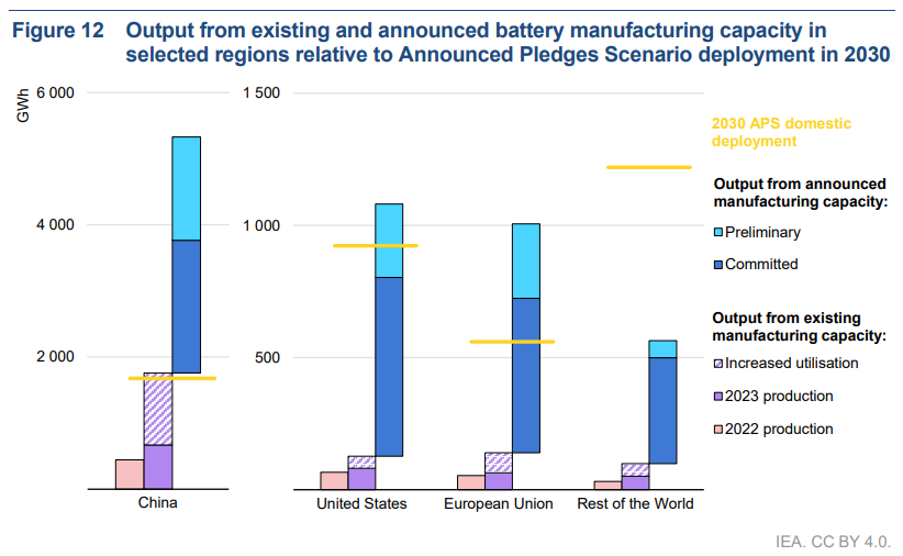 Notes: APS = Announced Pledges Scenario. 2023 production values reflect estimates of actual utilisation rates. Increased utilisation refers to the gap between 2023 production levels and existing capacity being utilised at 85%. A utilisation rate of 85% is used for both existing and announced manufacturing capacity in 2030. Demand refers to both EV battery and stationary storage demand. Battery capacity refers to battery cells. Battery refers to lithium-ion batteries. Refer to the Technical annex for more details on the analytical boundaries and methodologies used in this analysis.