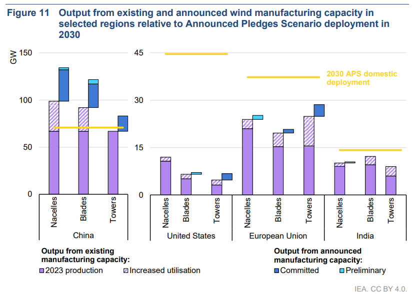 Notes: APS = Announced Pledges Scenario. The figure includes data on facilities which are specifically dedicated to wind manufacturing for blades, nacelles and towers, except for tower manufacturing in China, where an implausible shortfall is assumed to be met by additional generic fabrication capacity. 2023 production values reflect estimates of actual utilisation rates. A utilisation rate of 85% is used for both existing and announced dedicated manufacturing capacity in 2030. Refer to the Technical annex for more details on the analytical boundaries and methodologies used in this analysis.