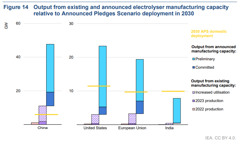 Notes: 2030 value includes all operational capacity in 2023 together with the capacity of announced manufacturing projects through to 2030. For electrolysers, the analysis only includes projects for which location data was available. Shares are based on manufacturing capacity. Refer to the Technical annex for more details on the analytical boundaries and methodologies used in this analysis.