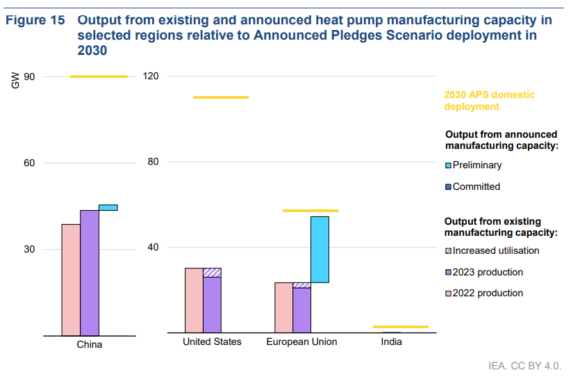 New manufacturing capacity for wind and electrolysers also grew faster in 2023, although the gains were not as dramatic. Existing capacity for wind could deliver nearly 50% of NZE Scenario needs in 2030, while announced projects could meet a further 12%. Meanwhile, capacity additions for heat pump manufacturing slowed due to stagnation in the majority of leading markets. Existing capacity could deliver only around one-third of 2030 needs in the NZE Scenario – though this could change quickly given the short lead times typical of capacity expansions in this industry.