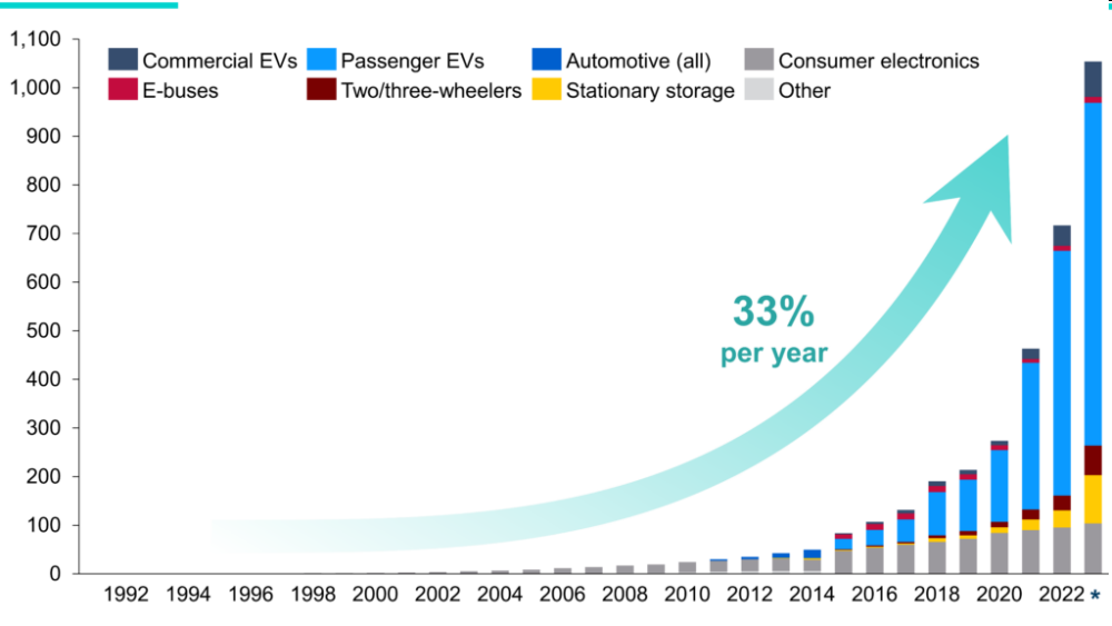 Exhibit 1: Global battery sales by sector, GWh/y / SOURCE: Ziegler and Trancik (2021), Placke et al. (2017) for 1991-2014; BNEF Long-Term Electric Vehicle Outlook (2023) for 2015-2022 and the latest outlook for 2023 (*) from the BNEF Lithium-Ion Battery Price Survey (2023).