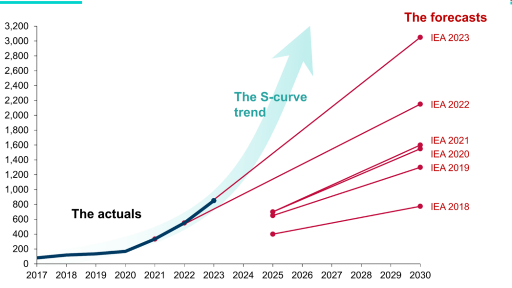 Exhibit 4: Automotive lithium-ion battery demand, IEA forecast vs. actuals, GWh/y / SOURCE: IEA Global EV Outlook (2018-2023) current policy scenarios and actuals; BNEF Long-Term Electric Vehicle Outlook (2023) for 2023 estimate.