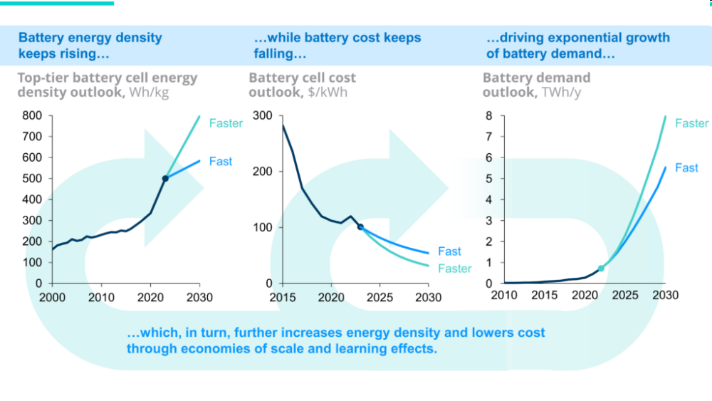 Exhibit 5: A reinforcing feedback loop between battery quality, cost and market size / Source: Ziegler and Trancik (2021) before 2018 (end of data), BNEF Long-Term Electric Vehicle Outlook (2023) since 2018, BNEF Lithium-Ion Battery Price Survey (2023) for 2015-2023, RMI analysis.