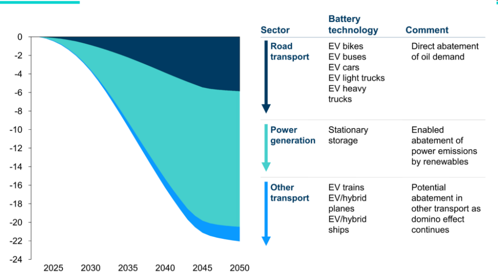 The best strategy to rapidly phase out fossil fuels is to accelerate the deployment of technologies that reduce fossil fuel demand. Batteries are on the path to displace 86 exajoules (EJ) of fossil fuels from road transport (emitting 6 GtCO2 per year) and to put at risk another 23 EJ (or 1.6 GtCO2/y) from shipping and aviation. In the electricity sector, as batteries synchronise the natural rhythms of the sun and the wind with the timing of electricity demand, they help enable the reduction of a further 175 EJ of fossil fuel demand (or almost 15 GtCO2/y).