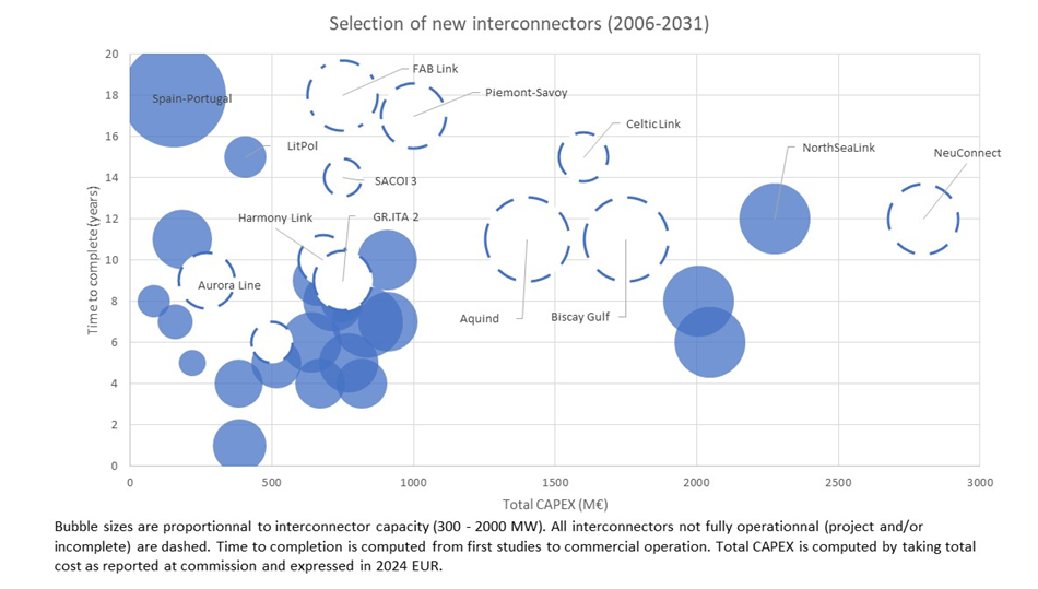 On average, a new interconnector takes roughly 9 years to bring to completion, from the initial studies to the beginning of commercial operations and costs more than €900m. This average is deeply affected by the complexity of the upstream permitting process that has to be completed on both sides of the border and that can lead to significant slippages in timetables, as Brexit notably illustrated.