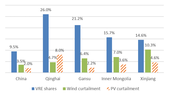 A comparison of shares of VRE capacity alongside wind and PV curtailment in China as a whole and in several of its provinces. / SOURCE: CEC, ‘Investment and Technologies for Net-Zero Carbon Infrastructure’