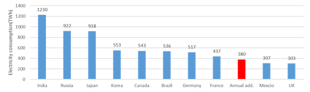Global electricity consumption by country, excluding China and the US. The red column represents annual additional electricity consumption in China / SOURCE: CEC, ‘Investment and Technologies for Net-Zero Carbon Infrastructure’