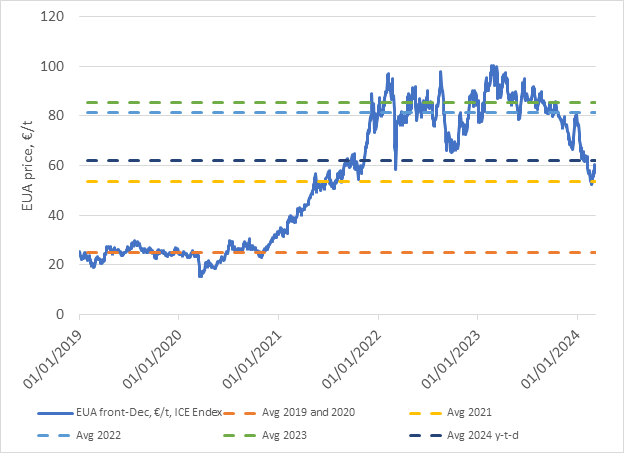 EUA prices 2019-2024 – ever increasing carbon prices year on year, 2024 an outlier so far. / SOURCE: ICE, Veyt