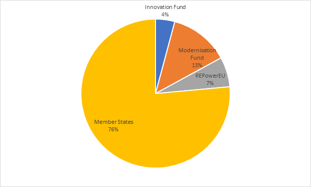 EUA auction revenues 2023 by recipient – member states coffers take the bigger hit from lowered carbon prices. / SOURCE: Veyt