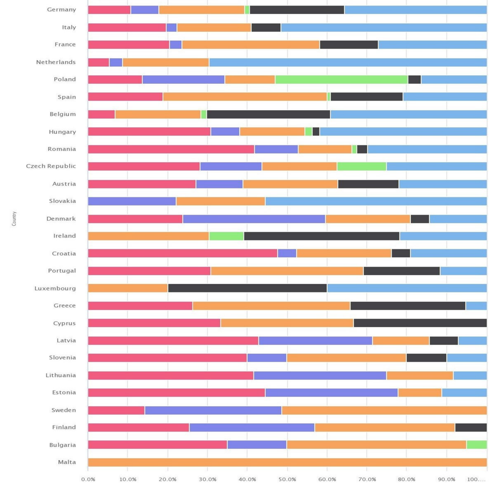 Figure 2: Residential energy use by energy carrier across EU-27 countries. Blue = gas; orange = electricity; red = renewables; purple = district heat; black = oil; green = coal