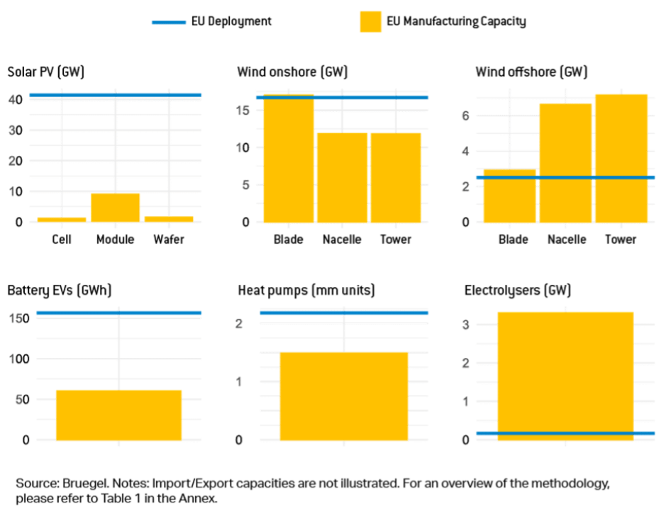 Figure 4: Europe’s Clean tech manufacturing Capacities and Domestic Deployment Levels in Selected Technologies, 2021-2022 / SOURCE: Sgaravatti, Tagliapietra, and Trasi, 2023