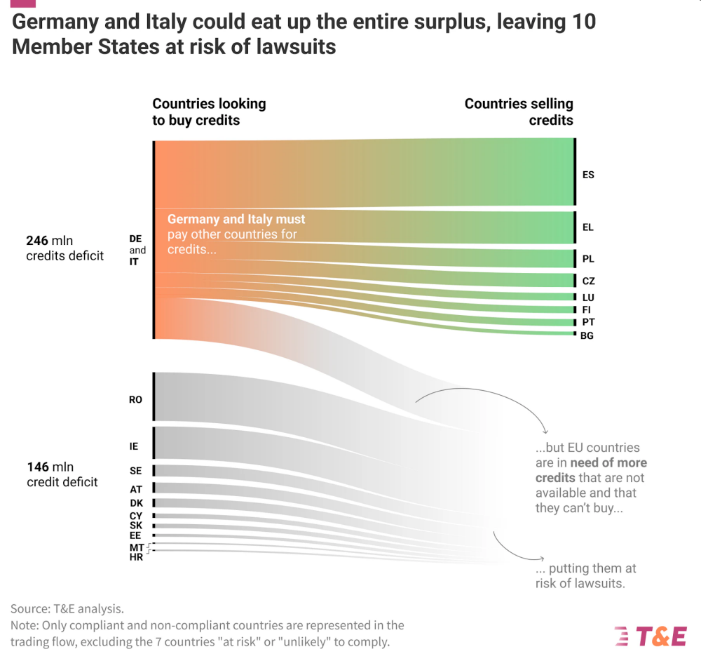 Sofie Defour, climate director at T&E, explains: “Germany and Italy are eating up all available carbon credits from their neighbours, leaving them stranded and at risk of legal proceedings. The German government will soon have to face its citizens asking for even more money and deepening the budget crisis yet further, to make up for their weak policies.”