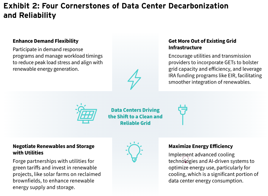 - Promote demand response and renewable energy programs, compelling utilities to design demand response initiatives for data centres and to negotiate tariffs that provide greater access to renewable energy and storage, potentially with data centres volunteering to bear all the incremental costs.