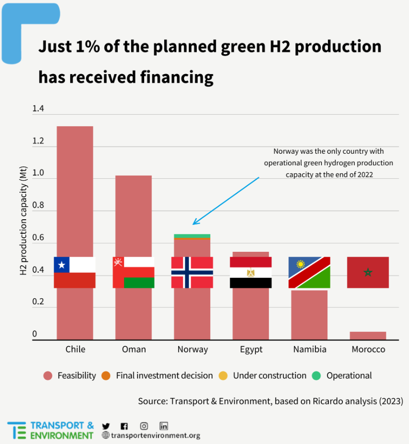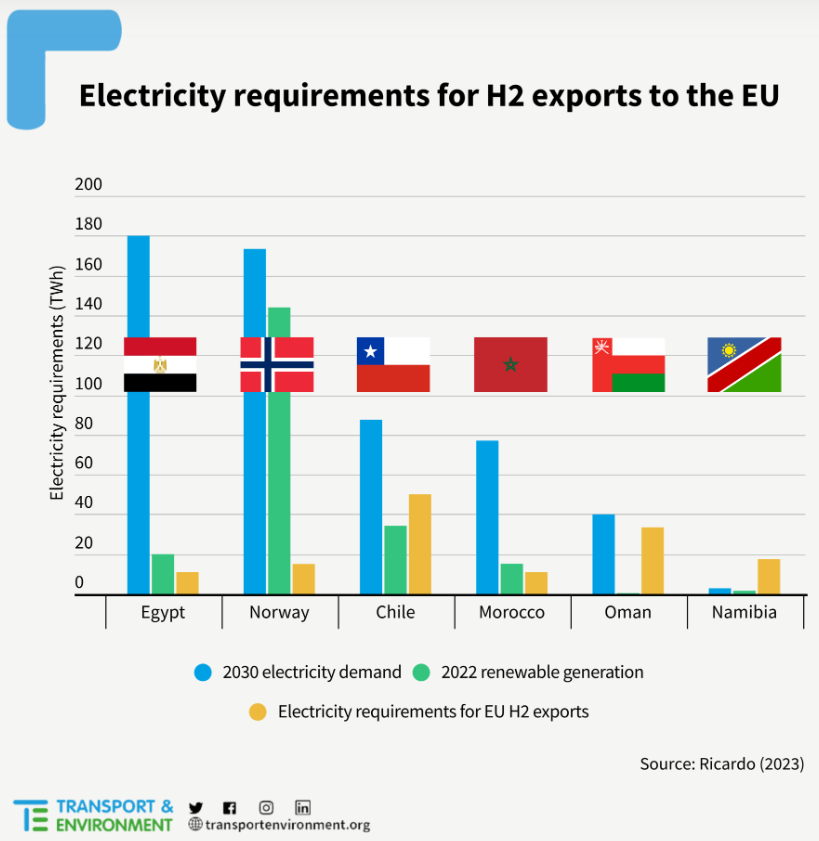 The EU’s RePowerEU, hastily decided following Russia’s invasion of Ukraine, sets out plans to produce 20 million tonnes of renewable hydrogen by 2030, with half of this coming from imports. The consultancy Ricardo on behalf of T&E looked at six countries with big plans to export hydrogen to the EU: Norway, Chile, Egypt, Morocco, Namibia and Oman. It estimates that these countries combined would only be able to deliver just a quarter of the 10 million tonnes of imports targeted by RePowerEU.
