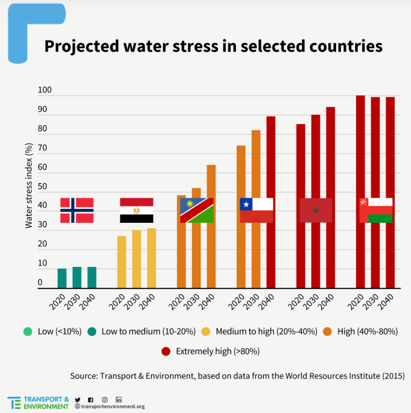 Hydrogen also requires significant amounts of water. Between 55 and 80 million tonnes of water would be required to produce the 2.6 Mt of H2 planned to be exported to the EU in 2030 – the equivalent of 32,000 olympic swimming pools every year. All the countries looked at, except Norway, will face significant water scarcity in the decades to come.