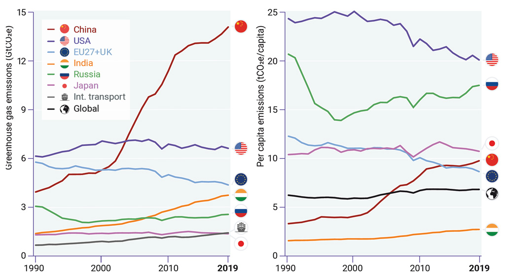 Greenhouse gas emissions (in gigatonnes – Gt – of CO2) from the top six emitting nations (excluding land-use change emissions) and including international transport. Left panel shows absolute emissions and the right panel shows per-capita emissions. / Source: Figure 2.2 of the 2020 UNEP Emissions Gap report.
