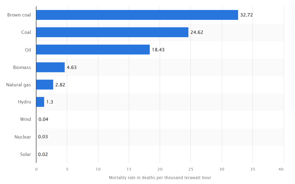 Nuclear power is less dangerous than even hydro power in terms of deaths per thousand terawatt hour. / IMAGE: Statista