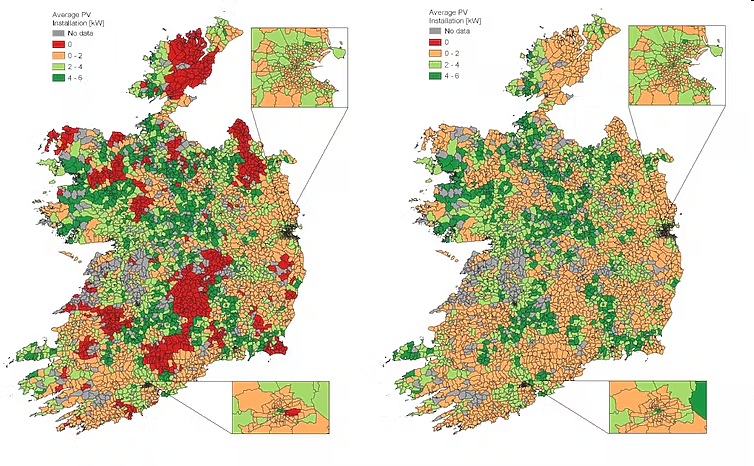 The authors simulated how much rooftop solar an average household in Ireland would have in 30 years with current policy (left) and if grid access was considered a shared resource (right) / SOURCE: Cuenca et al