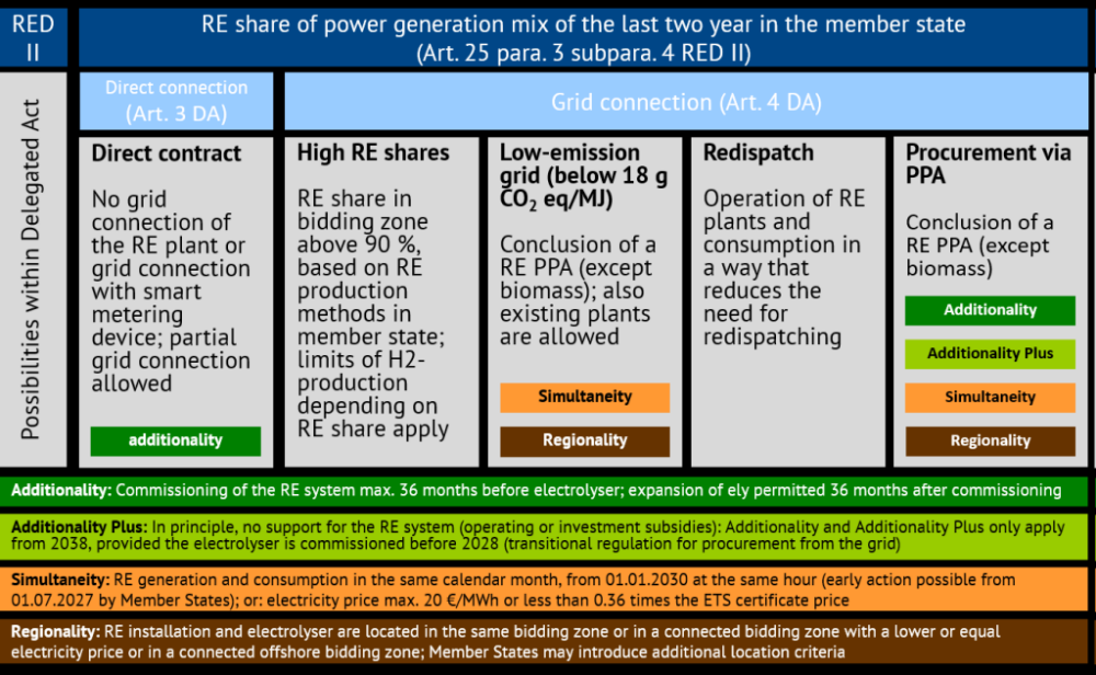 - Additionality: The commissioning of the RE plant is a maximum of 36 months before the commissioning of the electrolyser. An expansion of the electrolyser is permitted 36 months after commissioning.