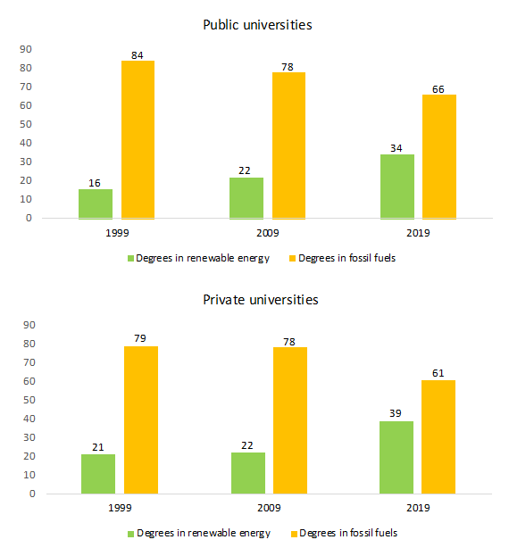 The global share of renewable energy degree programmes at public universities increased from 16% in 1999 to 34% in 2019 and from 21% in 1999 to 39% in 2019 at private universities. Thus, private universities have been slightly more active than public universities in shifting to clean energy education (see Figure D). This may be because private universities are less prone to carbon lock-in effects.