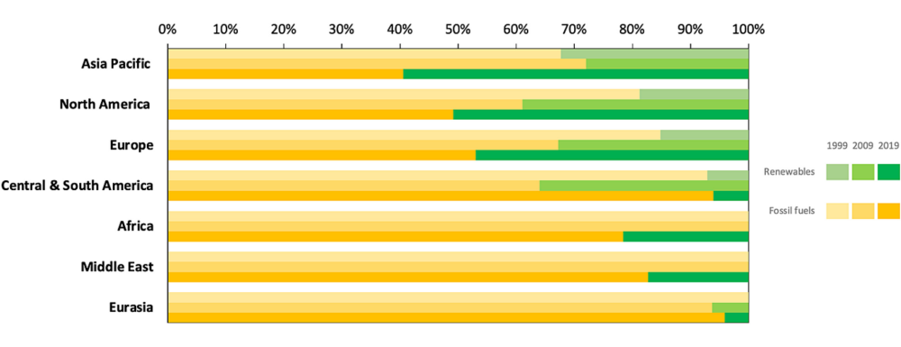 Renewable energy education still lags behind fossil fuel education in most of the regions. Asia Pacific, North America and Europe have come farthest in this respect, whereas universities in Africa, the Middle East, Central and South America, and Eurasia offer much fewer educational degrees in clean energy compared to fossil fuels.