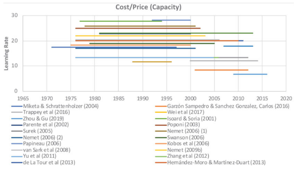The solar learning rates from the literature we reviewed are shown in the figure below in terms of cost decrease per unit of installed capacity. The length of the coloured line indicates the period over which the average rate was calculated.